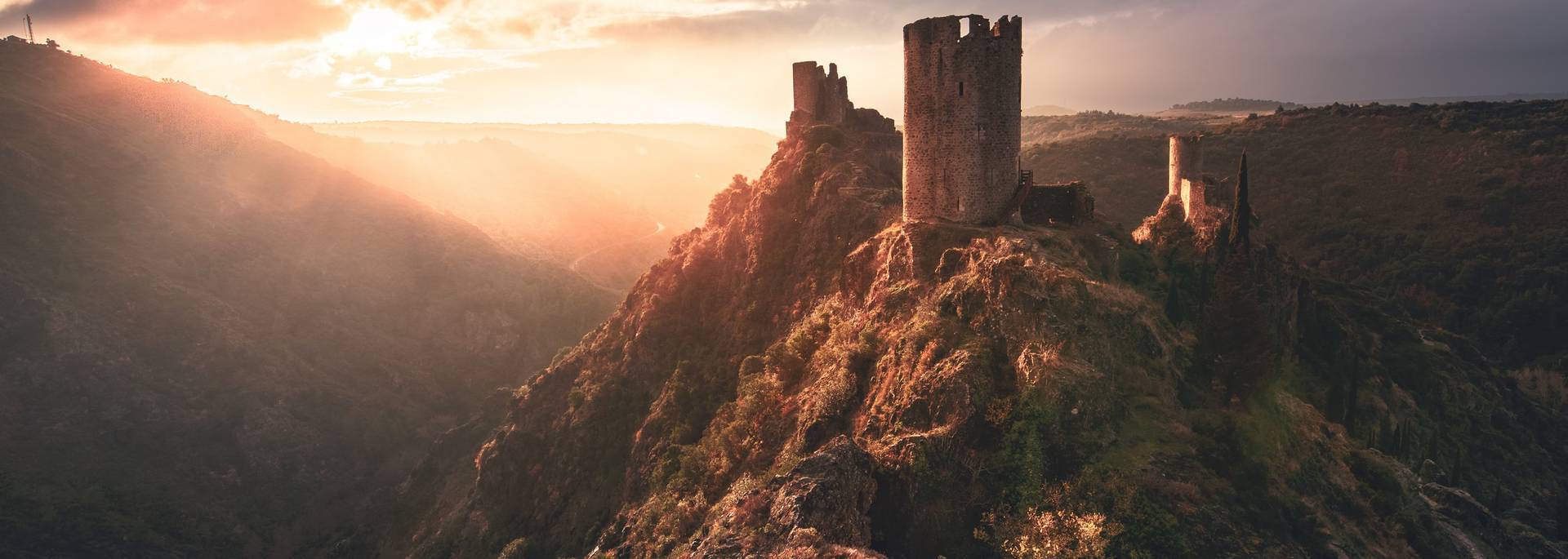 Quatre forteresses majestueuses se dressent au sommet d’un éperon rocheux qui domine la vallée de l’Orbiel.